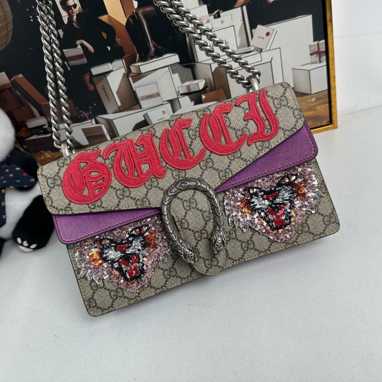 This used Gucci Dionysus Shoulder Bag is a stylish treasure for vintage Gucci bags enthusiasts. Made from iconic GG Supreme canvas, it features a signature Dionysus closure and bold sequin patches. With its silver-tone chain strap and sophisticated design, it’s an ideal pick among used designer handbags for those who cherish both flair and function.