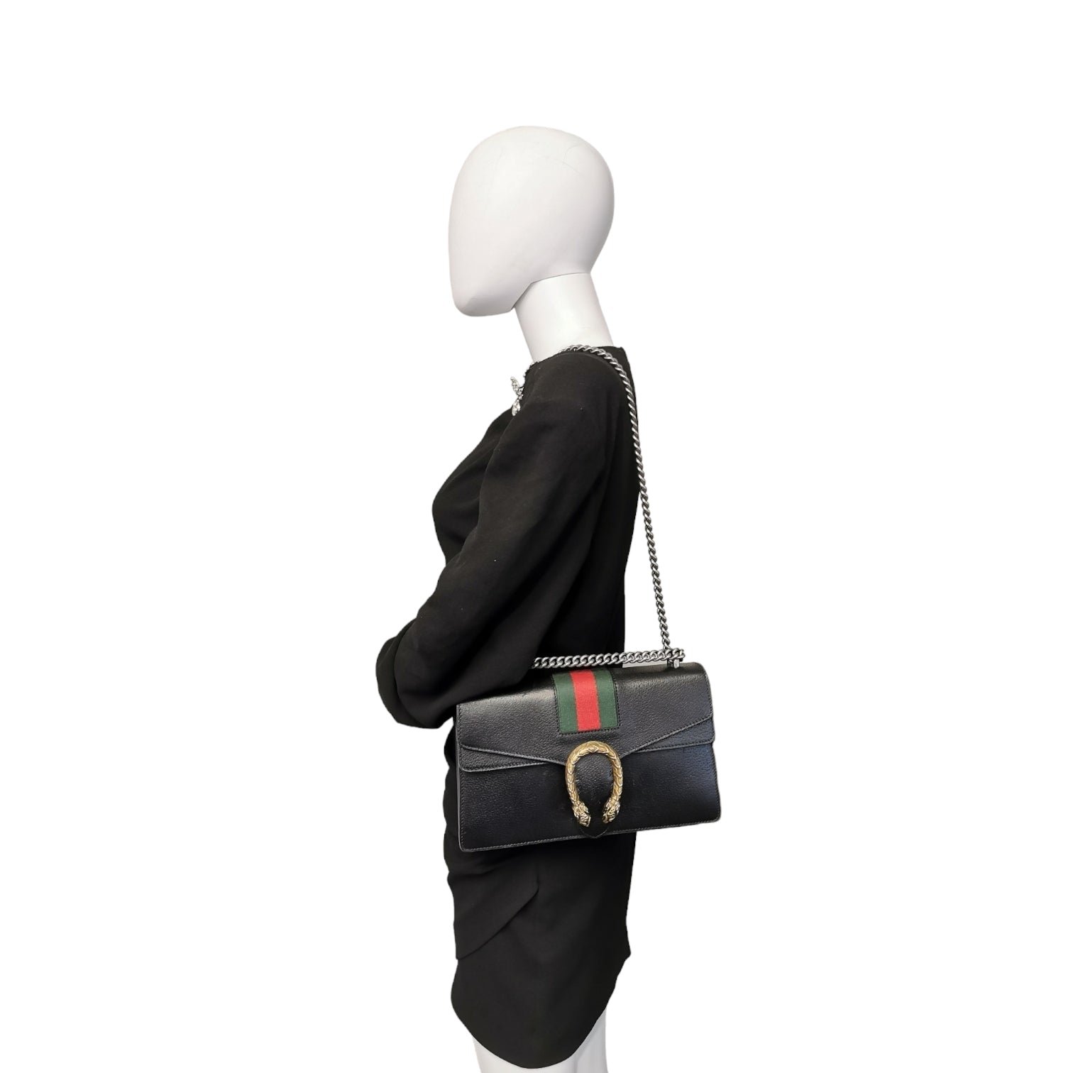 Dionysus, the Greek god of wine and joy, is the inspiration for the eponymous collection from the house of Gucci. The tiger head closure on the flap of this Bag in the small size refers to the legend according to which Dionysus is said to have crossed the Tigris on a tiger sent by Zeus. Secondly, the horseshoe shape of the buckle creates a reference to equestrianism, which is close to the Italian fashion house. This specimen was made of black leather. The Bag buckle is over the shoulder. It has a silver-colored chain strap, a flap with snap closure and an inner compartment with zipper.