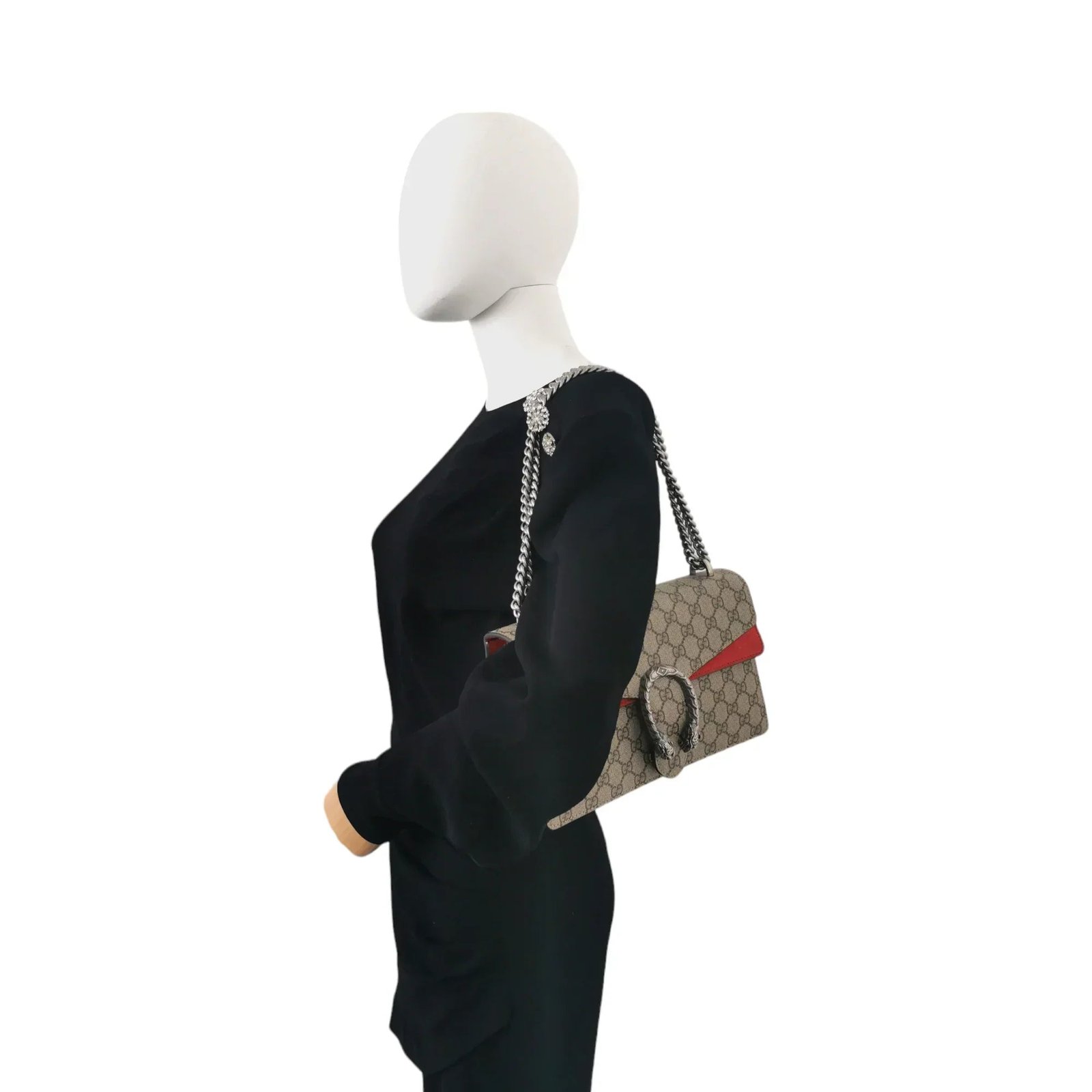 Dionysus, the Greek god of wine and joy, is the inspiration for the eponymous collection from the house of Gucci. The tiger head closure on the flap of this Bag in the small size refers to the legend according to which Dionysus is said to have crossed the Tigris on a tiger sent by Zeus. On the other hand, the horseshoe shape of the buckle creates a reference to equestrianism, which is close to the Italian fashion house. The Bag is over the shoulder. It has a silver-colored chain strap, a flap with snap closure and an inner compartment with zipper.