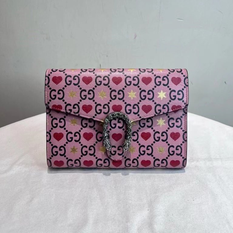 This limited edition Gucci Dionysus Bag features an exquisite Valentine’s GG printed leather. Crafted with precision, it offers a striking combination of hearts and stars, making it a unique addition to any collection. Carry your essentials in style with this standout piece. Perfect for elevating any outfit with a touch of luxury.
