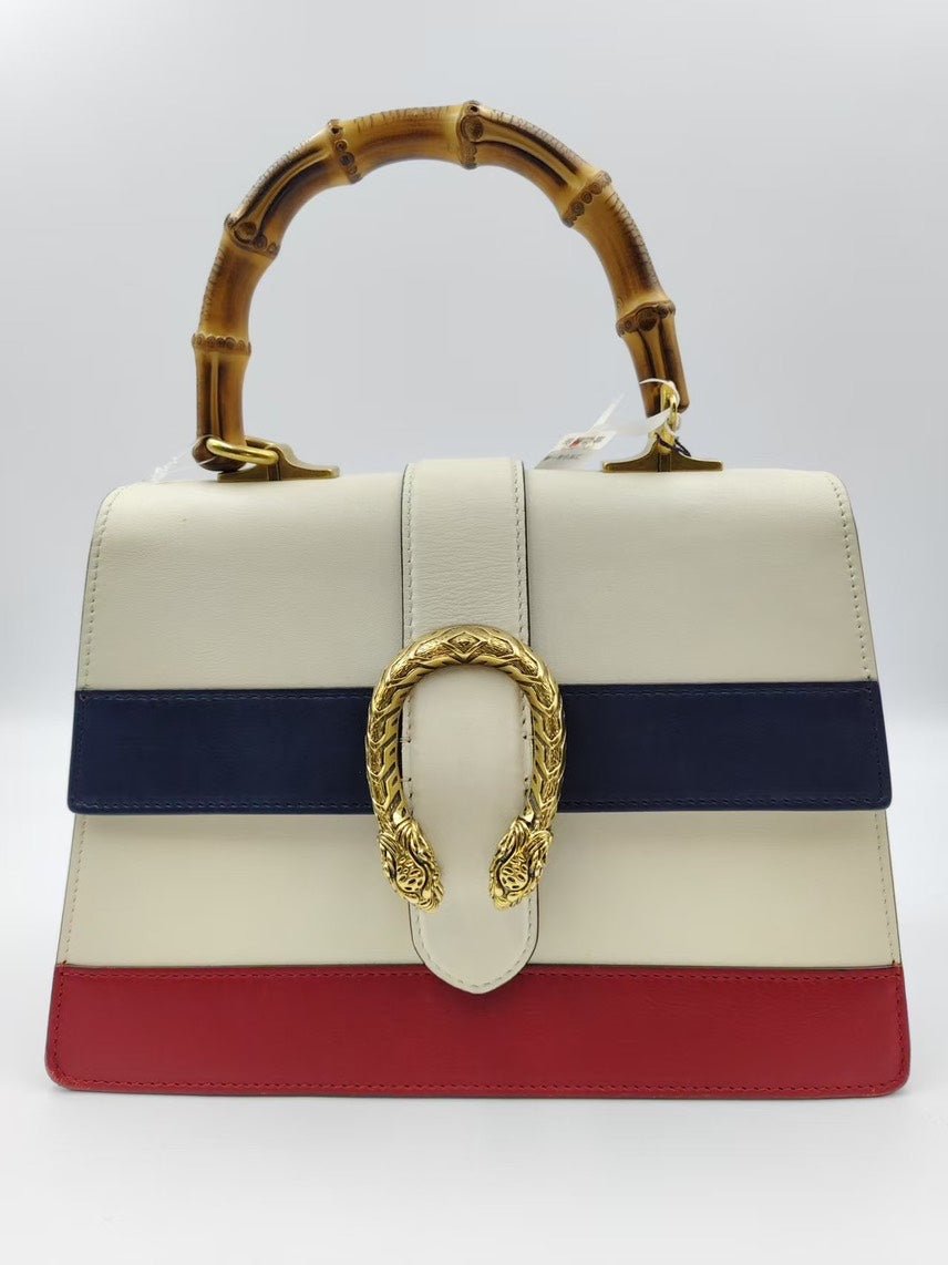 This authentic used Gucci Dionysus White Leather Shoulder Bag offers a chic touch to any wardrobe. The beautifully crafted leather design includes a striking bamboo handle and gold-tone hardware, embodying elegance in a timeless style. The interior is lined with soft beige suede, providing convenient storage space. For anyone passionate about vintage Gucci bags, this piece is a classic selection among used designer handbags.