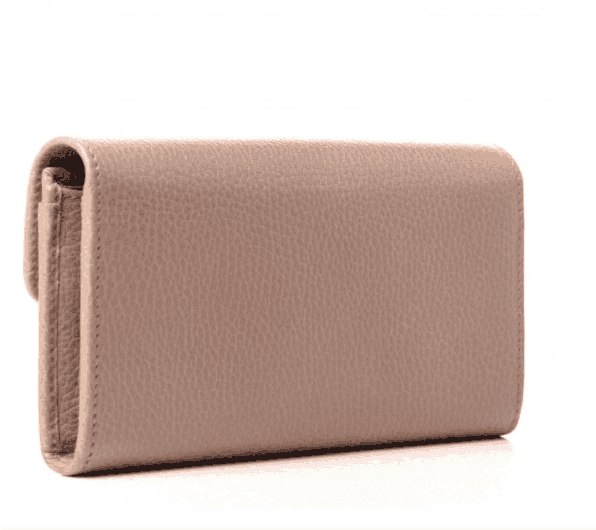 GUCCI Dollar Calfskin Interlocking G Continental Wallet in Antique Pink. This stylish wallet is crafted of textured calfskin leather in nude beige. The wallet features a crossover flap with a polished light gold interlocking Gucci GG logo. The flap opens to a compact brown leather and black fabric interior with card slots and a zipper compartment. This is a beautiful accessory wallet for everyday use, from Gucci!