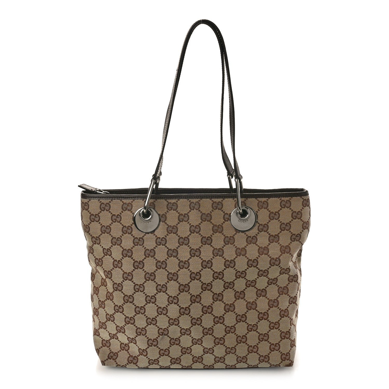Crafted with precision and attention to detail, the Gucci Eclipse Tote features sturdy handles for easy carrying and a secure zip closure to keep your belongings safe. The rich brown color complements any outfit, making it a timeless accessory for any fashion-forward individual.
