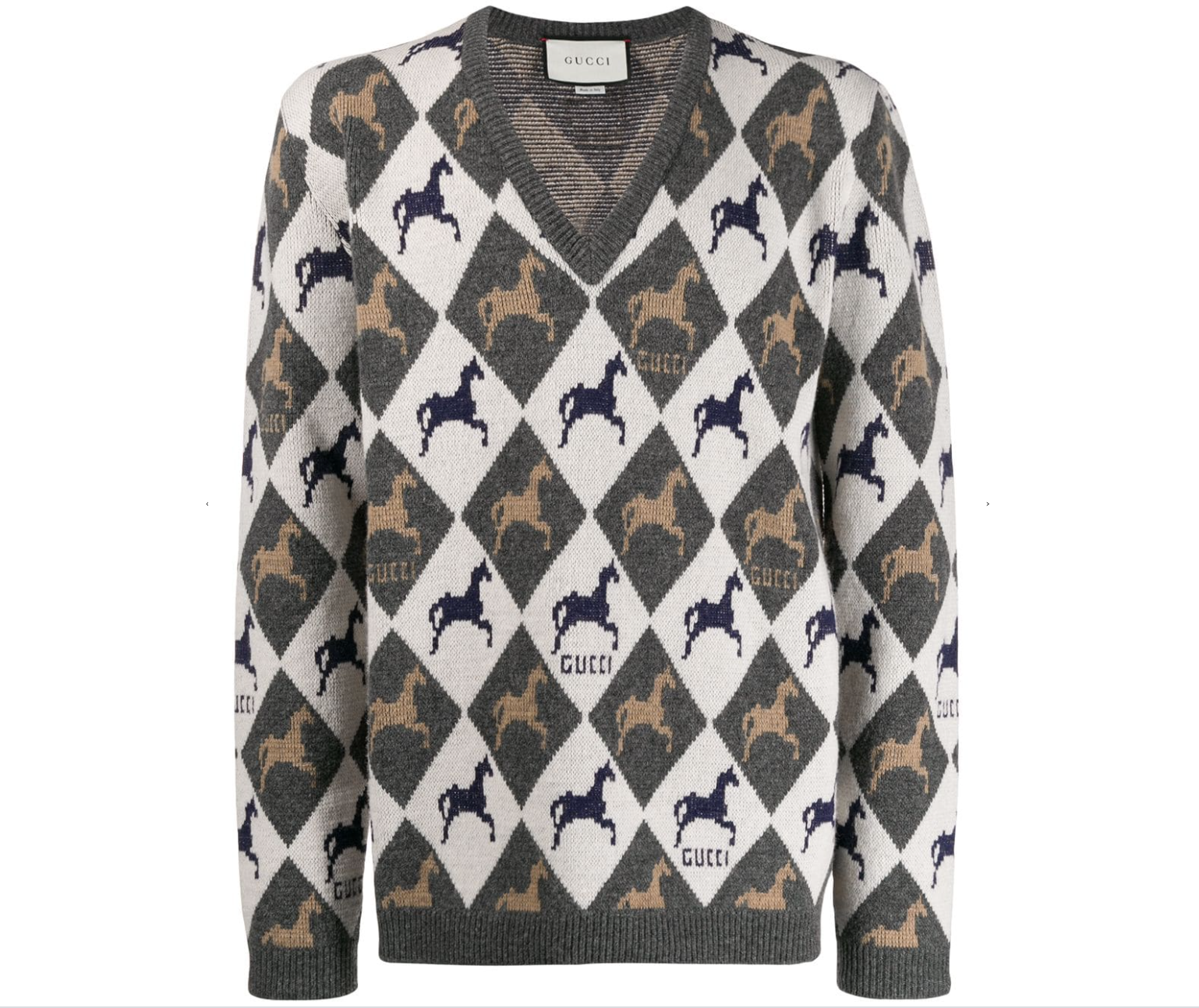 The Gucci Equestrian Diamond Jacquard Sweater in Gray and White is crafted of 100% wool in Italy. This knit sweater features an equestrian, diamond jacquard pattern, a v-neck, long sleeves, a ribbed hem and cuffs, and Gucci logo accents.