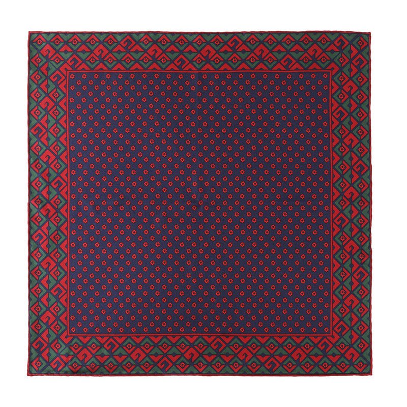 The Gucci Flower Print Pocket Square in Blue is crafted from 100% silk twill in Italy. This pocket square features little red flowers laid over a navy blue background, all framed by a geometric diamond border in green and red.