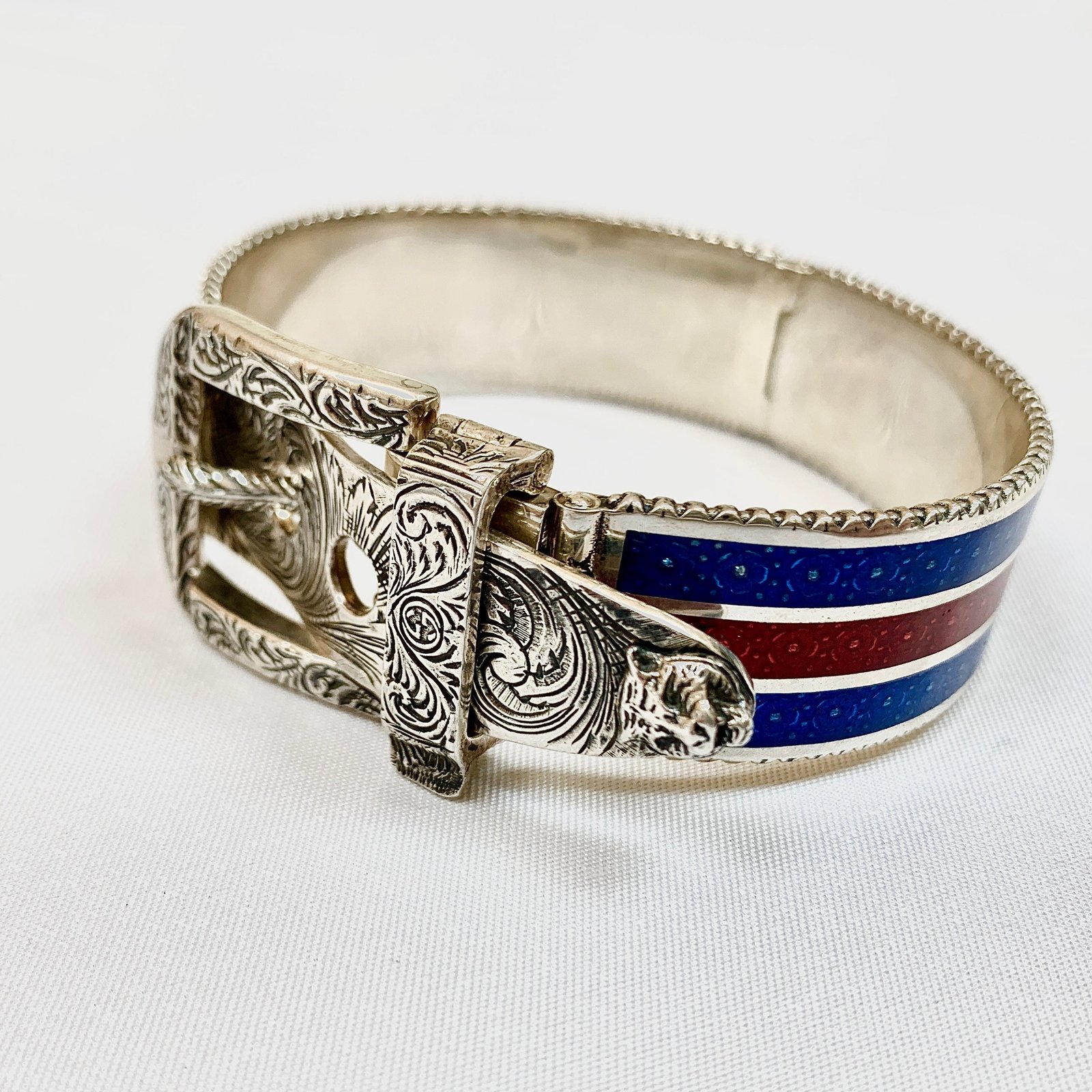 The Gucci Garden Metal Striped Buckle Bracelet in Sterling Silver is crafted from an antique finish sterling silver in Italy. This metal bracelet features a sparkling blue and red resin web design, textured trim, and a garden designed buckle closure.