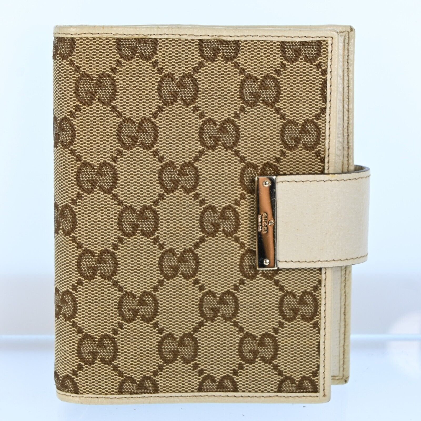 Elevate your organization game with the Gucci GG Canvas Planner Cover in luxurious beige leather. This sophisticated accessory seamlessly combines style and functionality, featuring the iconic GG canvas pattern and a sleek leather finish. Keep your planner safe and secure while making a fashion statement with this chic cover.