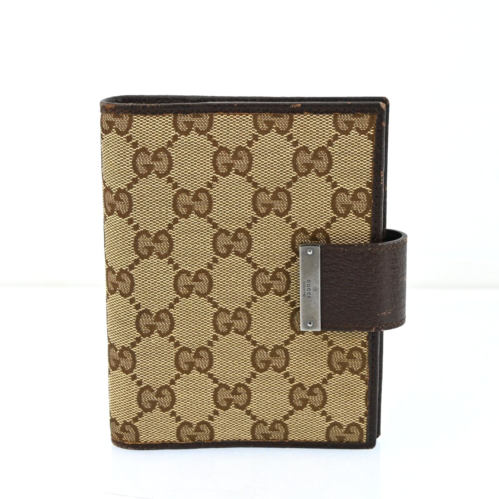 Elevate your organization game with the Gucci GG Canvas Planner Cover in elegant beige leather. Crafted in Italy, this luxurious accessory features the iconic GG canvas print, exuding sophistication and style. The interior boasts multiple pockets and card slots, perfect for keeping your essentials in place. Whether for work or personal use, this planner cover is a chic and practical addition to your daily routine. Stay on top of your schedule in the most fashionable way possible with Gucci.