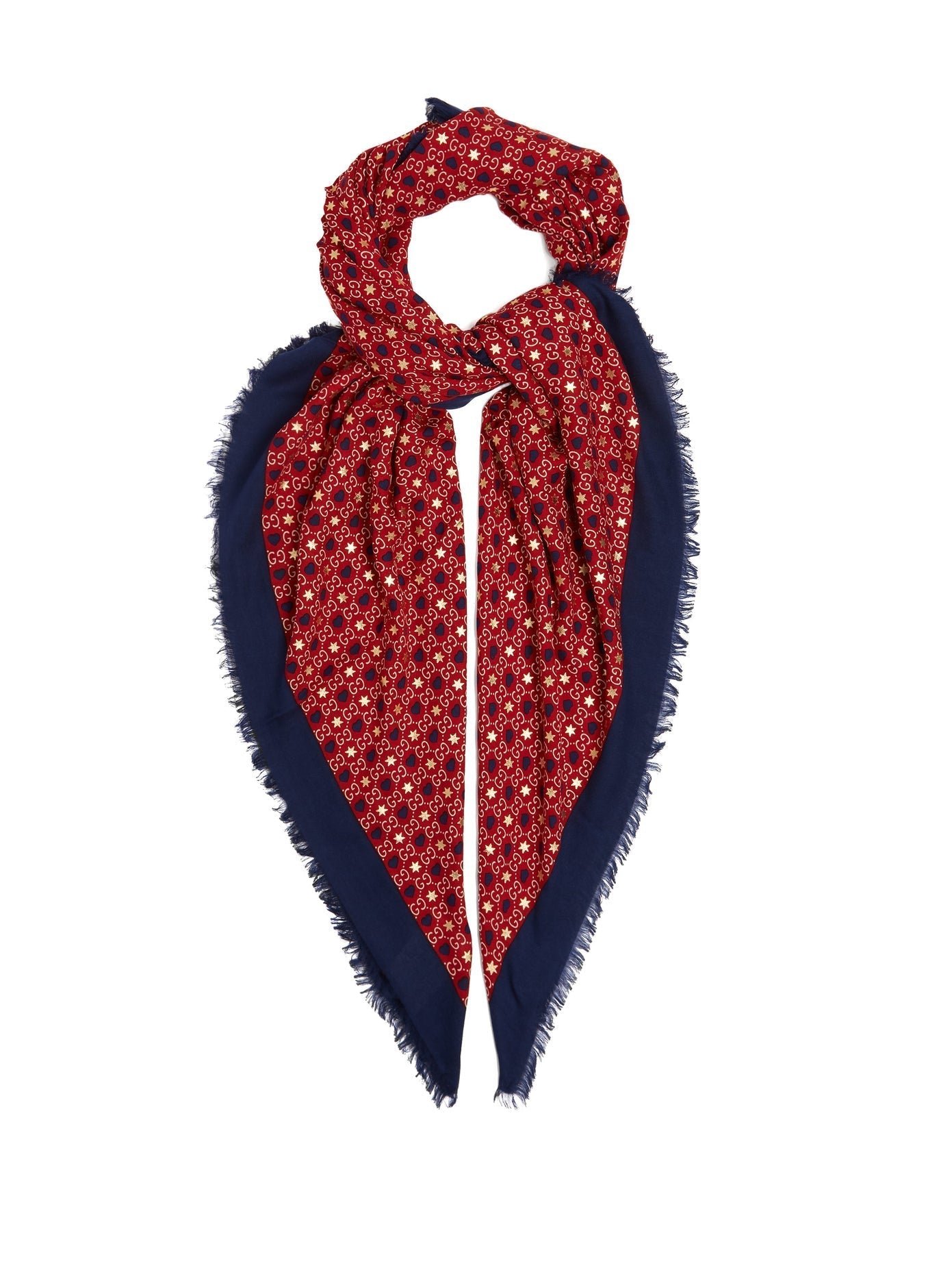 The Gucci GG Hearts & Stars Silk Scarf in Red is crafted in Italy from a whisper-weight modal blend and is finished with a navy border and delicate eyelash fringing. This scarf, which can be worn as a shaw, features the interlocking GG pattern with sparkling gold stars and navy hearts.