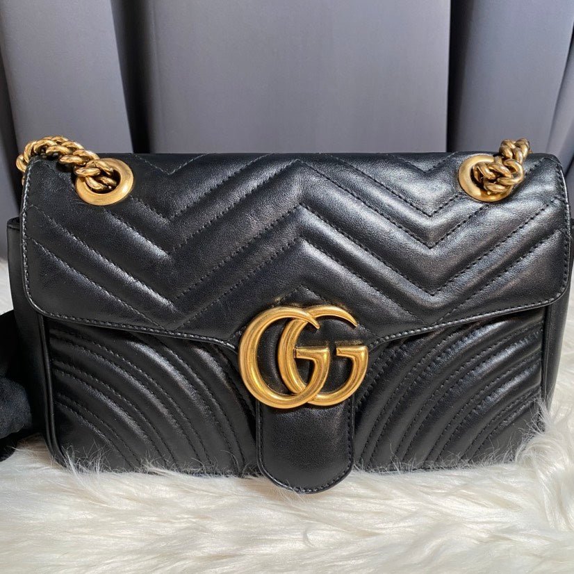 Discover the elegance of vintage Gucci bags with this authentic Gucci GG Marmont Black Leather Shoulder Bag. Crafted with chevron-quilted leather, the iconic GG logo hardware shines with sophistication. The interior is lined with durable fabric, offering ample space for essentials. Perfect for collectors and those who adore used designer handbags, this piece is a chic addition to any wardrobe.