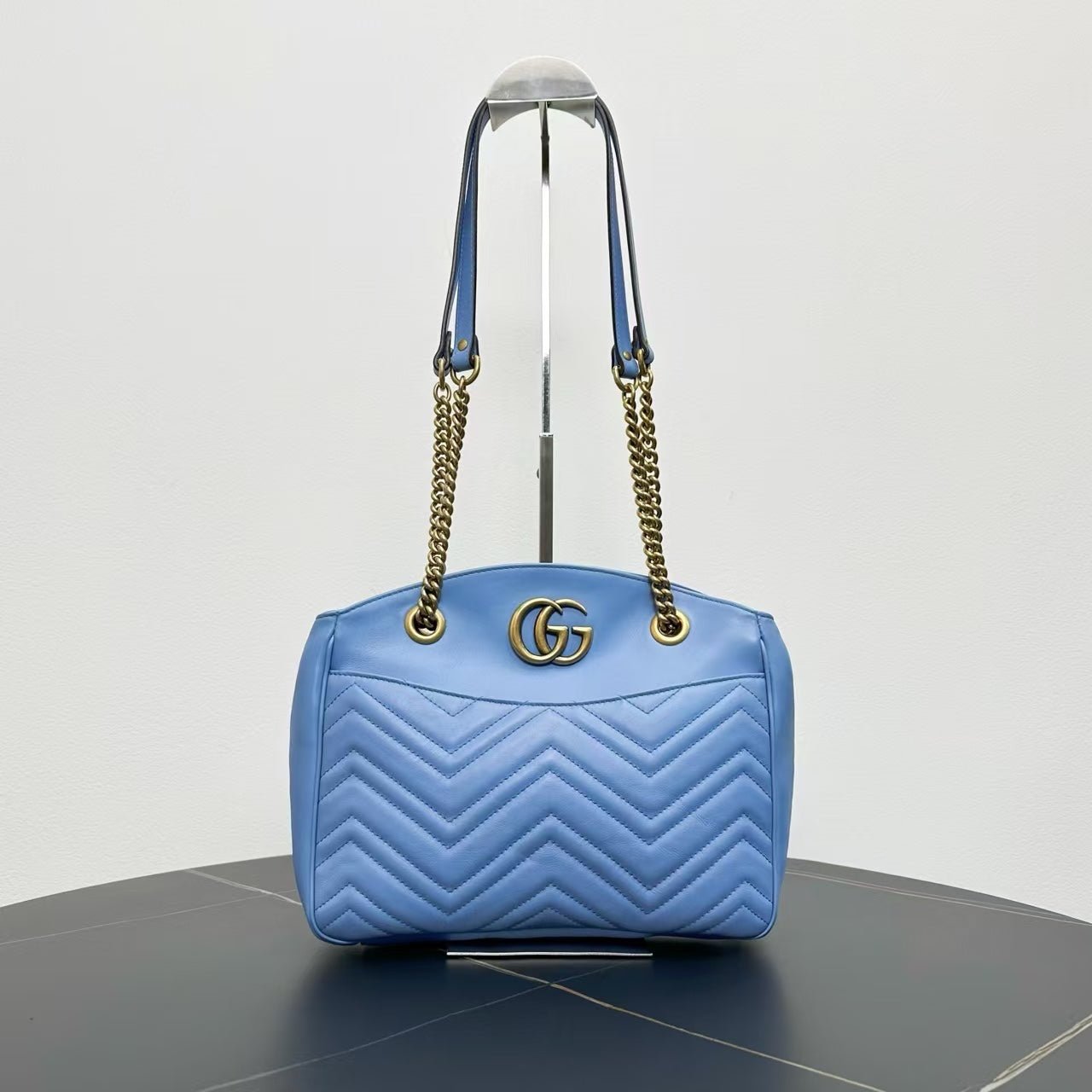 This preloved Gucci GG Marmont tote bag is a chic choice for those who admire style and versatility. Crafted in luxurious blue leather with a striking chevron pattern, this bag is perfect for collectors of vintage Gucci bags. The gold hardware, including the iconic GG emblem, adds a sophisticated touch, while the spacious interior with practical compartments makes it an ideal option for everyday use or special occasions. A standout among used designer handbags, this tote combines timeless elegance with modern functionality.