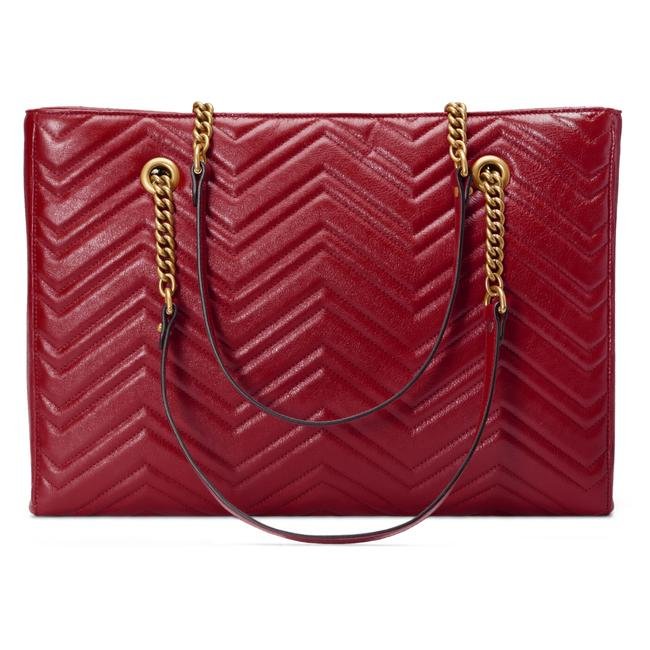 The Gucci GG Marmont Matelassé Leather Shoulder Bag in Red is a gorgeous leather bag with a tote silhouette which is accented by antique gold-tone hardware. Exquisite matelasse stitching accentuates the streamlined silhouette of a trim tote bag branded with antiqued double-G hardware inspired by an archival design.