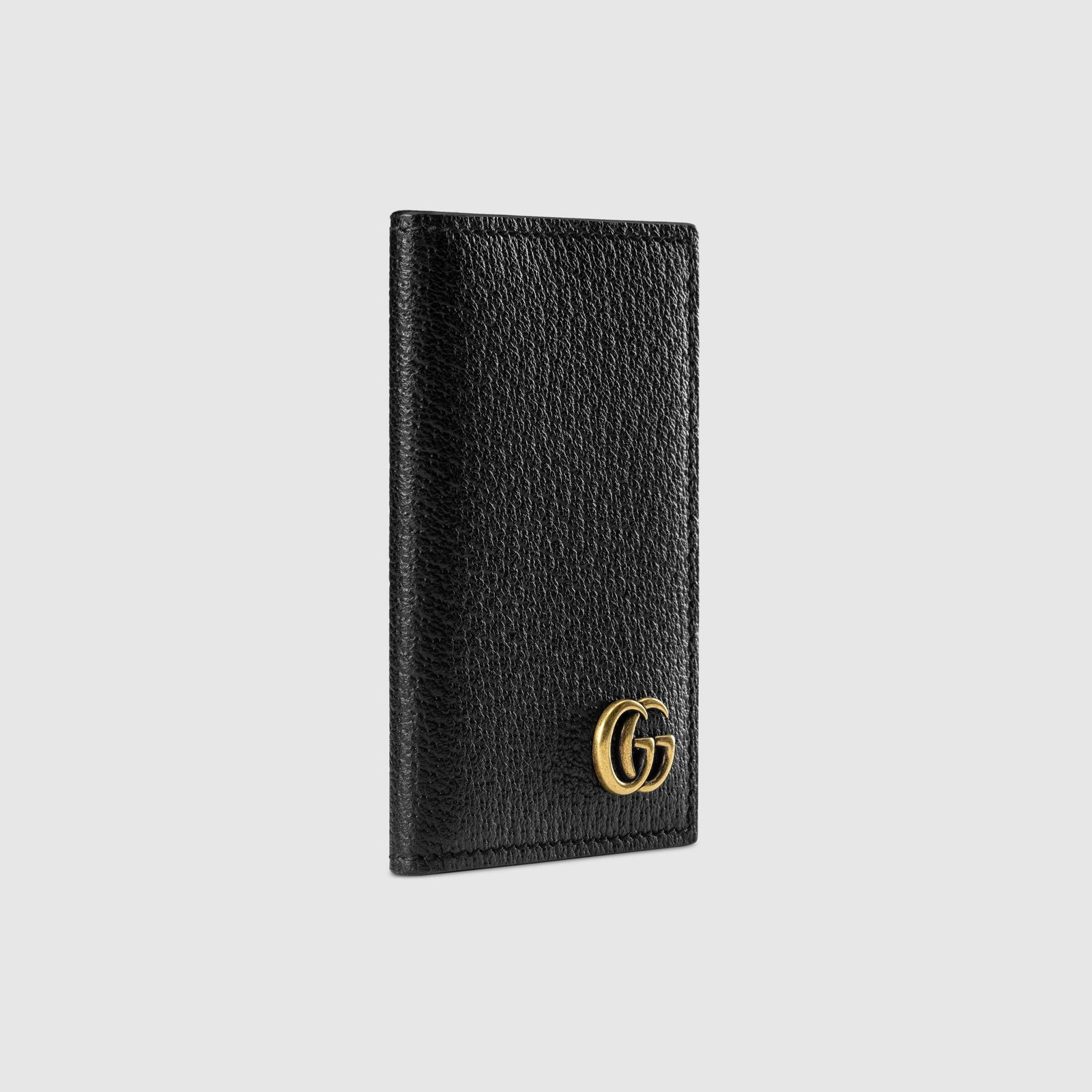 The Gucci GG Marmont Passport Holder in Black is crafted in Italy from a smooth calfskin leather in Italy. This document holder wallet features the GG logo in polished gold and opens to a slot for your passport holder, 3 card slots, and 2 slip pockets.