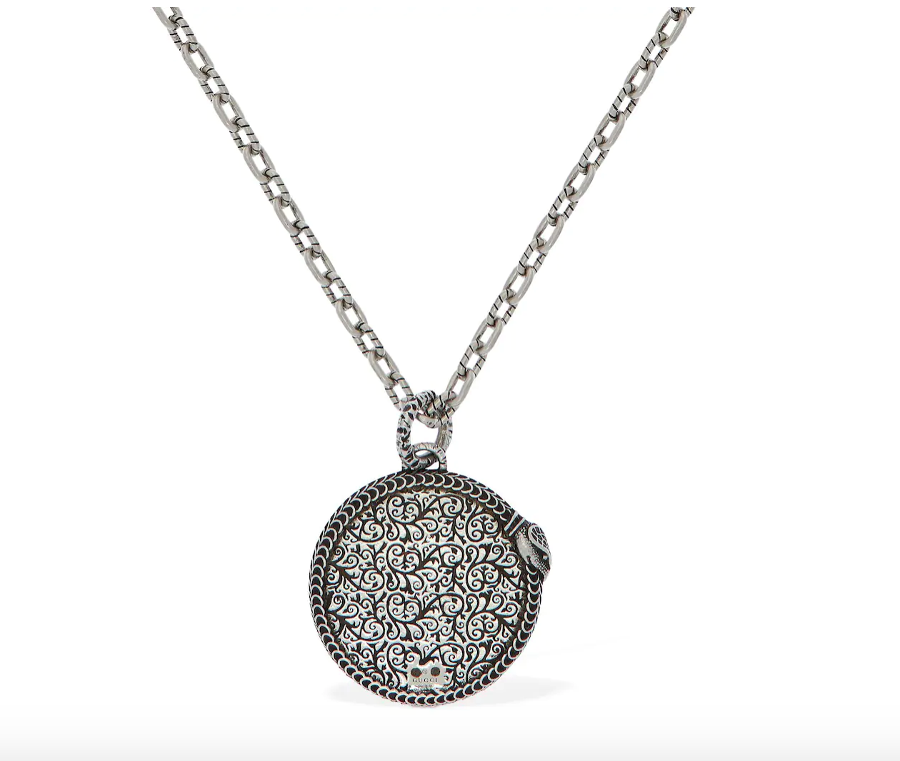 The Gucci GG Marmont Pendant Necklace in Sterling Silver is a round pendant crafted in Italy with a three-dimensional Double G, leaves motif and snake-shaped trim along the edges. The back is engraved in a swirling design, which the large chain link chain features tasteful notches for extra texture.
