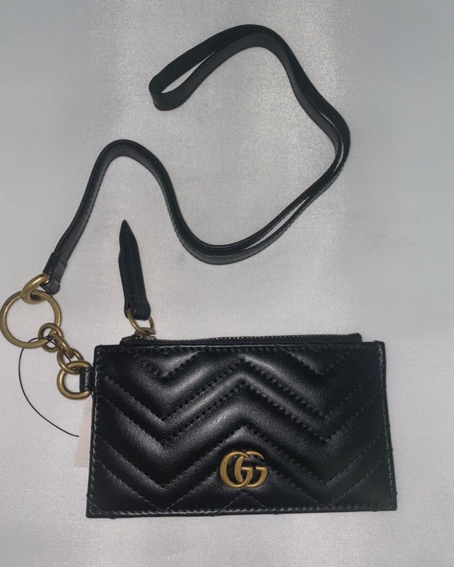 Gucci’s ‘GG Marmont’ cardholder is such a stylish, lightweight alternative to a wallet – the compact silhouette has just enough space for your ID, most-used cards, and a few coins. Made in Italy from black leather, it’s decorated with the house’s signature chevron quilting and burnished gold logo. It comes with a strap and it can be worn on your neck.