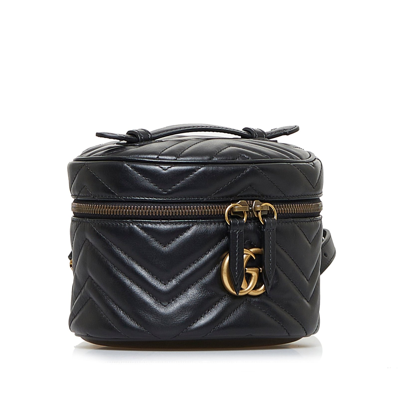 This Gucci GG Marmont Round Backpack is made of black leather, which has a nice volume thanks to its matelassé quilting. On the front, the backpack has a gold GG logo. The Bag features a leather handle on the lid and closes with a wrap-around zipper. On the back, the leather carries a heart quilting and has leather back straps with gold chain detailing for a comfortable carry on the back.