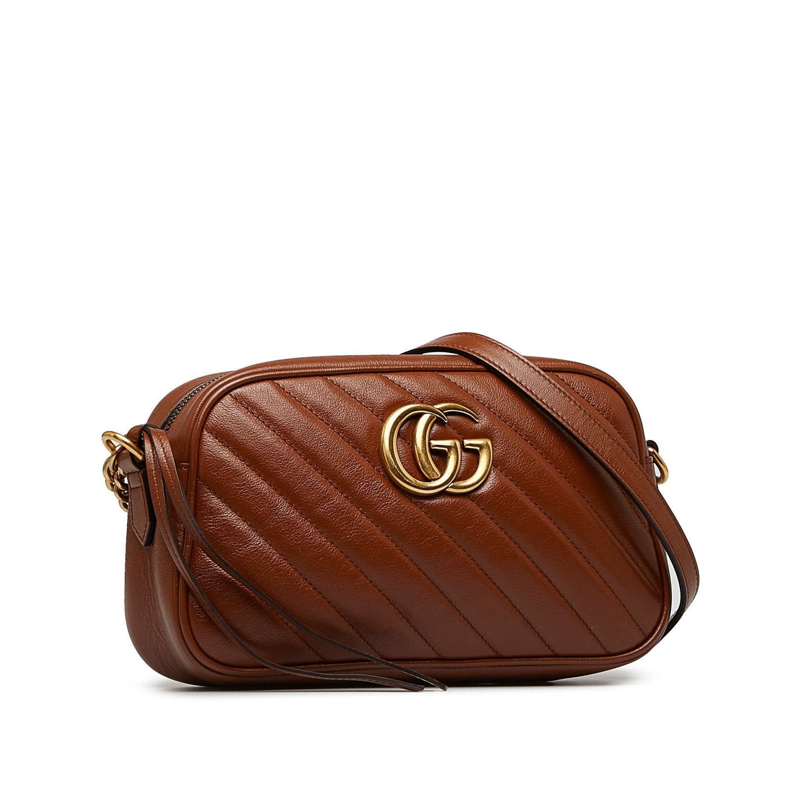 This Gucci Marmont crossbody bag is made of brown calfskin that has a matelassé quilting. With this quilting, the leather is kept and acquires a beautiful volume. On the front, the familiar GG logo shines in matte gold. The Bag is preferably crossbody with the help of a leather strap with gold chain details. Inside, this small Bag has a slip pocket.
