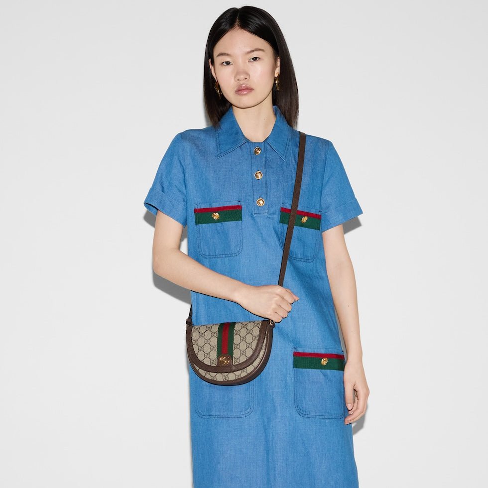 Gucci GG Ophidia Supreme Mini Shoulder Bag in GG Supreme canvas with gold hardware. This mini cross body style has a flap closure. Practical for both day or evening use. Effortlessly chic, this bag looks stylish with a casual outfit. Can be worn over shoulder or cross body using adjustable shoulder strap. Fits iPhone, AirPod, small wallet.