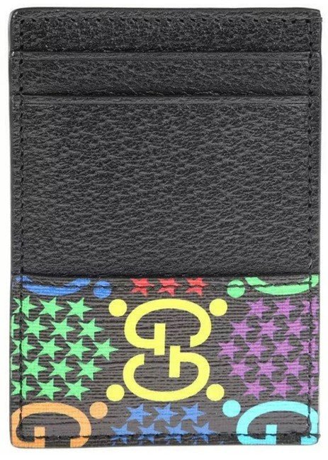 The Gucci GG Psychedelic Leather Card Case is a structured, slim leather case in the Gucci psychedelic motif pattern of the interlocking GG and stars in many hues. One side features 2 card slots while the other has 2 card slots and an open slot for easy access. The center includes a center slip pocket.