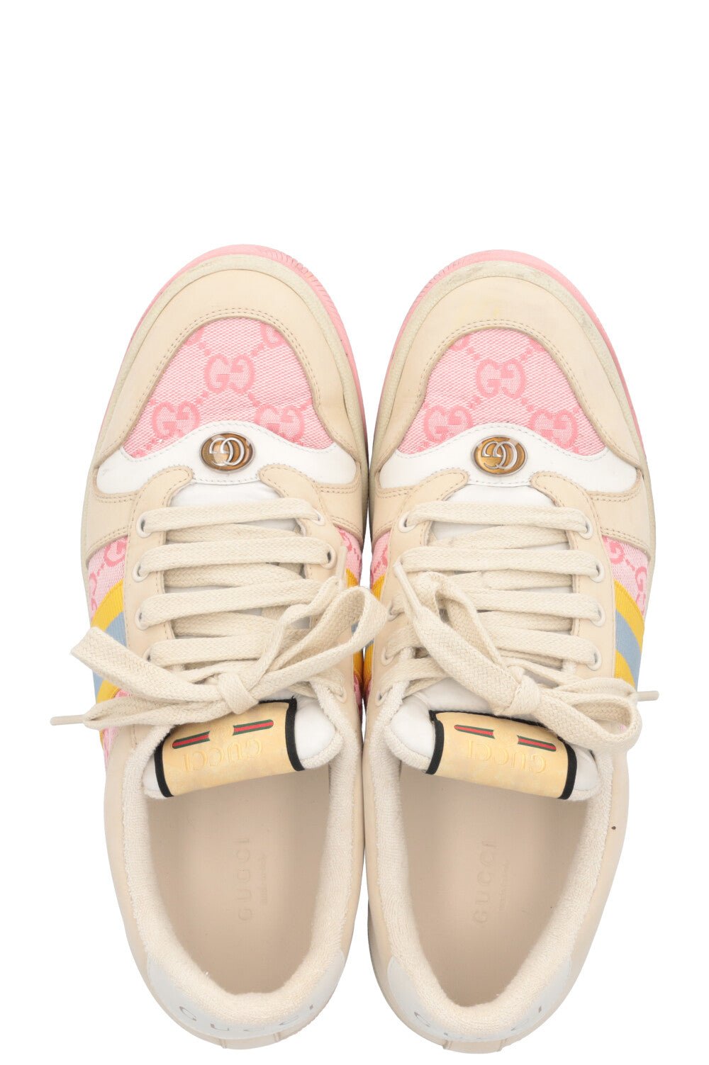 Die GG Screener Sneakers von Gucci verbinden Retro-Charme mit modernem Streetstyle. Inspiriert von den klassischen Turnschuhen der 70er-Jahre, fängt dieser Schuh den angesagten Vintage-Vibe perfekt ein. Die Farbkombination aus zartem Rosa und Ivory verleiht den Schuhen eine feminine Note. Das ikonische GG-Muster und die charakteristischen Webstreifen unterstreichen die unverkennbare Handschrift des Hauses Gucci. Ein cooler Allrounder, der sich mühelos zu verschiedenen Looks kombinieren lässt.