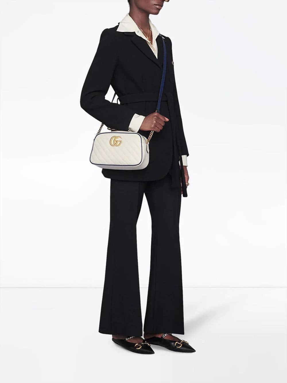 The Gucci Small GG Marmont Shoulder Bag in White is crafted in Italy from supple leather and has a softly structured shape and a zip top closure with the Double G hardware. The chain shoulder strap has a leather shoulder detail. The bag is made in matelassé leather with a chevron design and GG on the back. Nothing beats a statement bag. This small GG Marmont crossbody from Gucci is sure to become a staple piece that you reach for every day. Invest in the best.