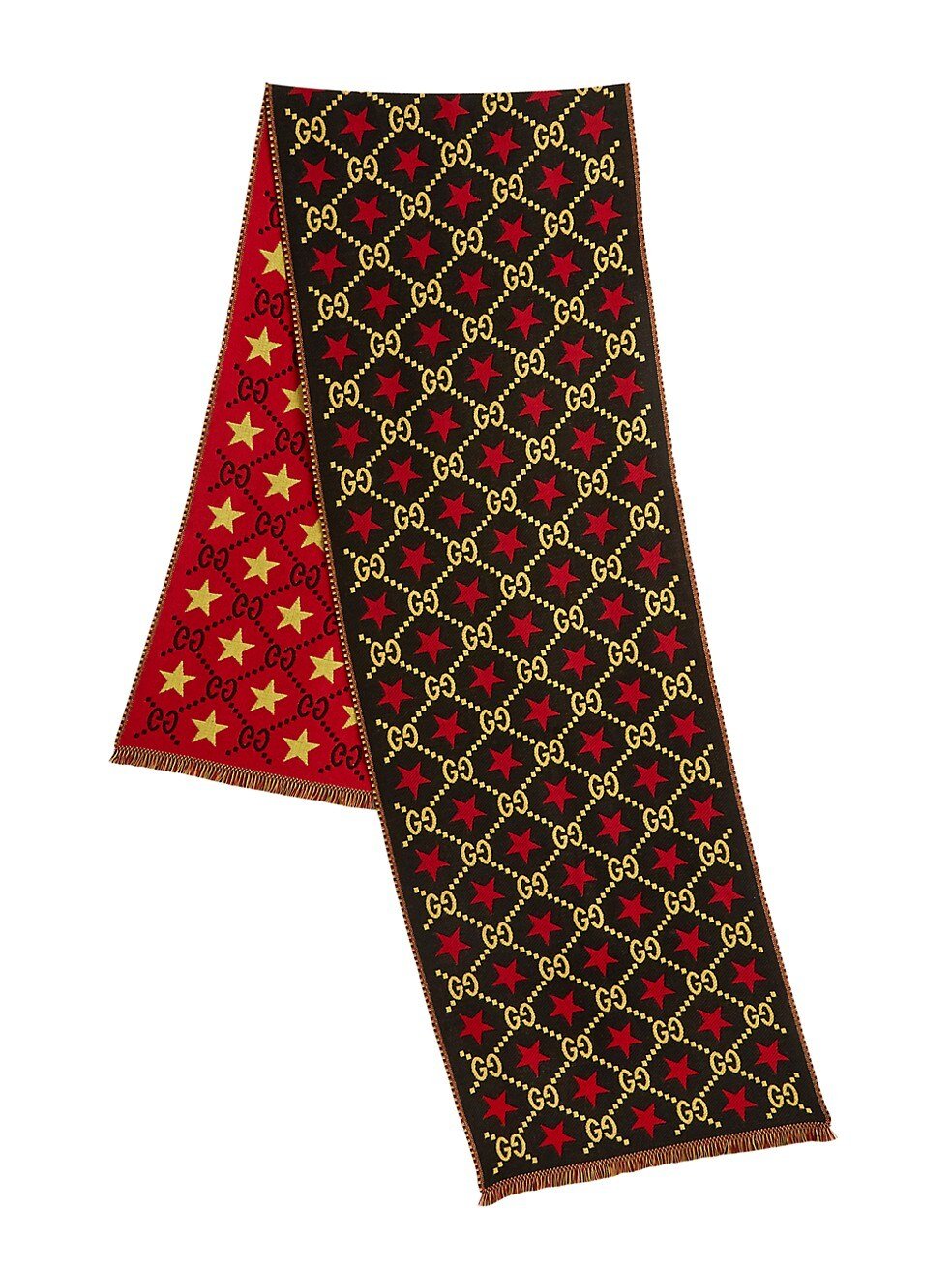 The Gucci GG Stars Scarf in Black and Red is a cozy 100% wool scarf that dawns the signature interlocking GG pattern. This reversible accessory has a bold red on one ride and a deep navy on the other. Short, gentle fringe decorates the edges for a textured look.