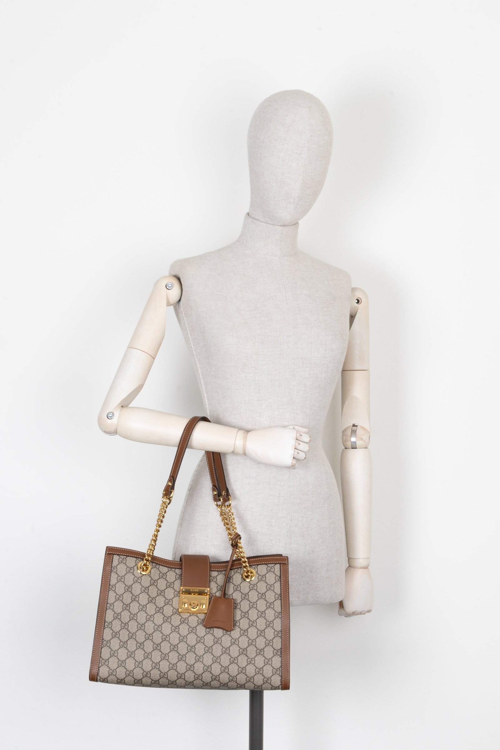 Die Gucci GG Supreme Padlock Tote Bag vereint zeitloses Design mit funktionaler Eleganz. Gefertigt aus dem ikonischen GG Supreme Canvas und veredelt mit edlen Lederdetails, besticht sie durch ihren markanten Schlossverschluss, der an klassische Kofferdesigns erinnert. Dank ihres grosszügigen Innenraums bietet sie genügend Platz für den Alltag und verleiht jedem Look eine stilvolle Note.