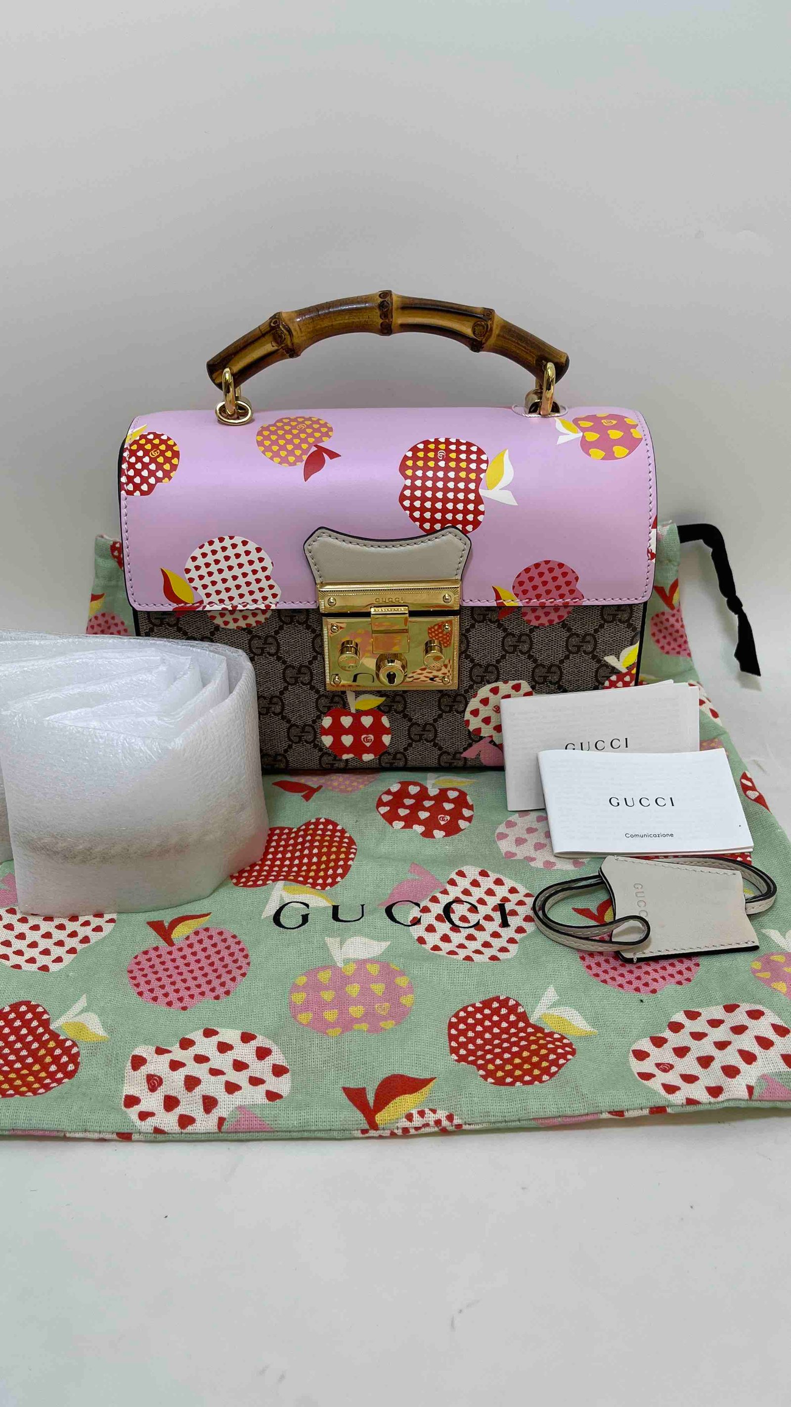 Embrace elegance with this authentic used Gucci GG Supreme Bamboo Handle Bag. Featuring a playful heart and apple pattern on iconic GG canvas, it stands out in vintage Gucci bags. This used designer handbag, equipped with a bamboo handle and secure gold hardware lock, defines luxury and functionality. Perfect for fashion lovers and collectors alike.