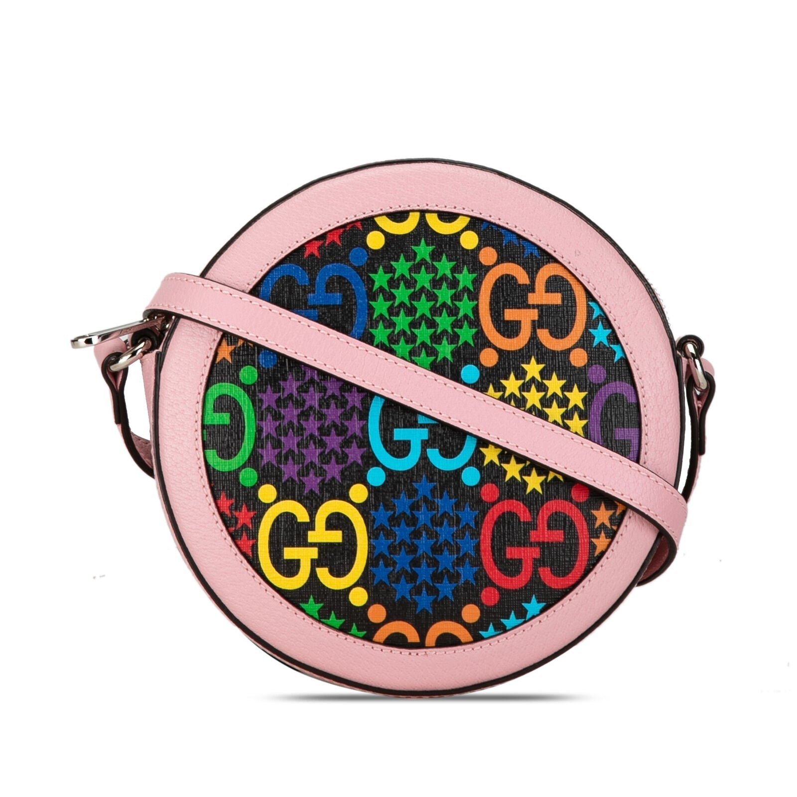 Elevate your style with the Auth Gucci GG Supreme Psychedelic Round Crossbody in Pink. Crafted from premium canvas, this eye-catching bag features the iconic GG Supreme monogram in vibrant psychedelic hues. The adjustable leather strap ensures a comfortable fit, while the compact size makes it perfect for carrying your essentials on the go. Make a bold fashion statement with this unique and versatile accessory from Gucci.