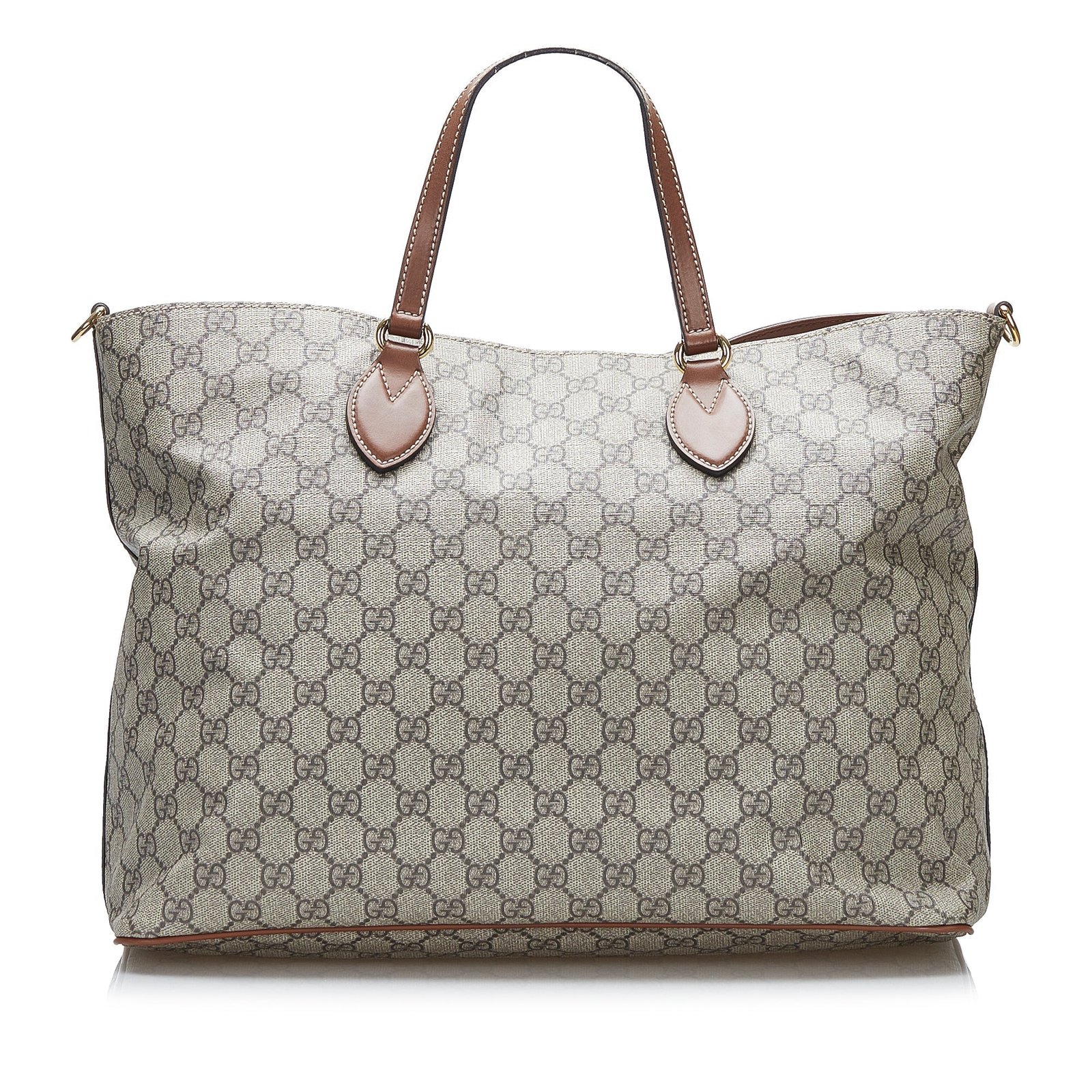 This satchel features a coated canvas body, flat leather handles, a detachable flat leather strap, an open top with a magnetic closure, and interior zip and slip pockets.