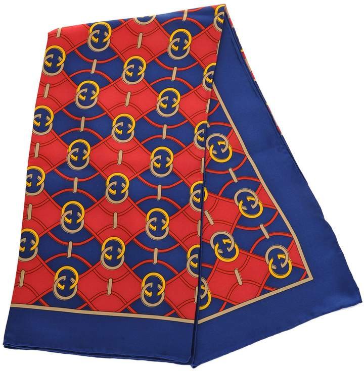 The Gucci GG Waves Rhombus Silk Scarf in Navy is crafted in Italian silk and features the original Gucci rhombus motif in navy, red, and gold, a design that dates back to the 1930s. It’s combined with the interlocking GG logo into a rhombus waves pattern, which is framed by a solid navy border.