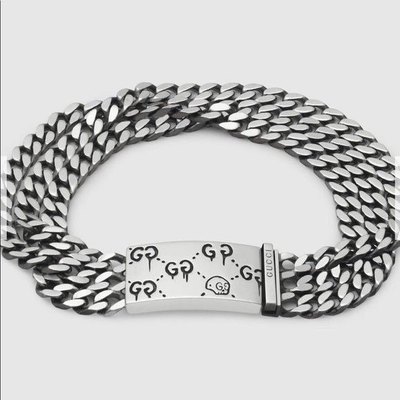 The Gucci Ghost Chain Bracelet in Silver is comprised of 3 flattened chains of antique sterling silver, brought together with a rectangle clasp. The clasp is a pin, push release closure which features the interlocking GG pattern in the GucciGhost motif.
