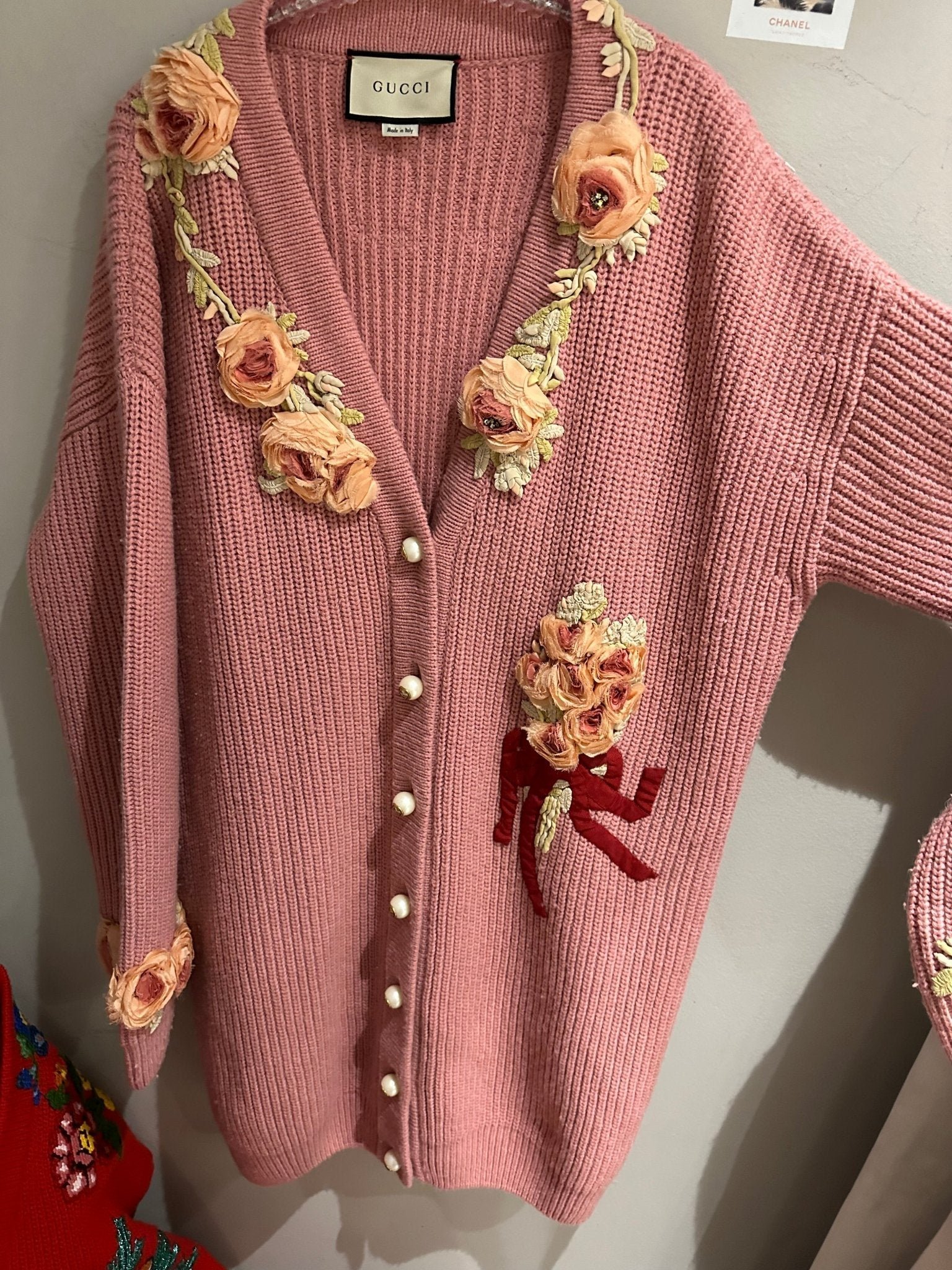 Superbe gilet brodé entièrement aux emblèmes Gucci, affiche en taille L mais aussi canon en oversize, boutons perles avec logo GG. Convient jusqu’à un 44. Très bon état ne présente pas de défaut.