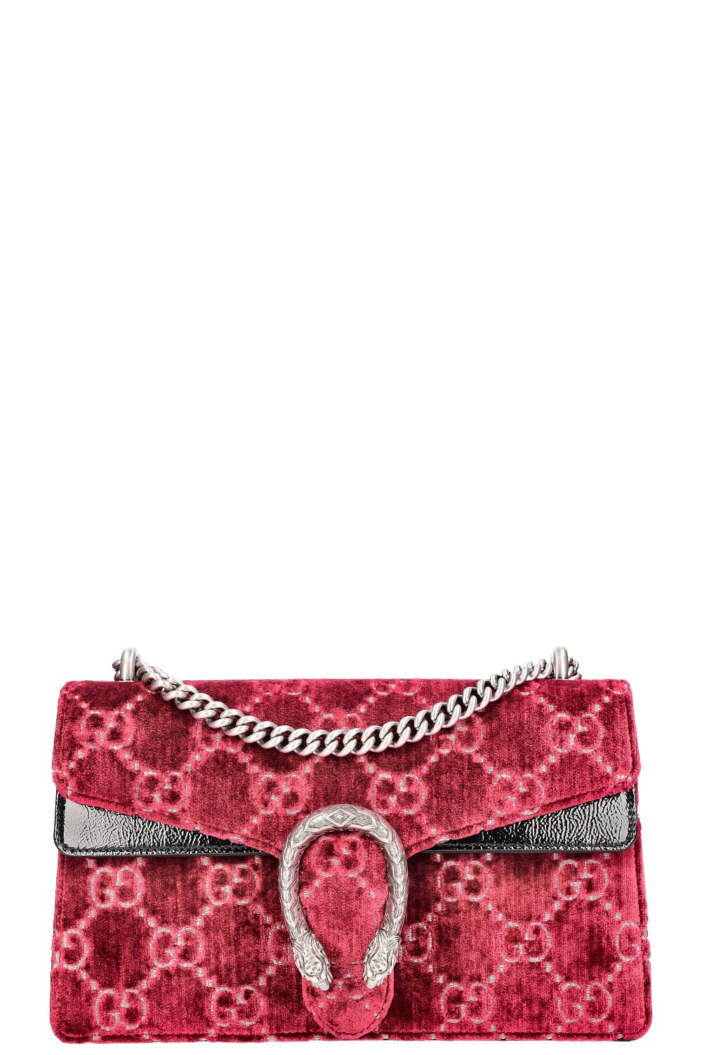 We love: Eine Gucci Favoritin aus rotem Samt. Der typische Tigerkopf ziert die Vorderseite des Flaps. Mit Kontrast Lackleder Elementen versehen