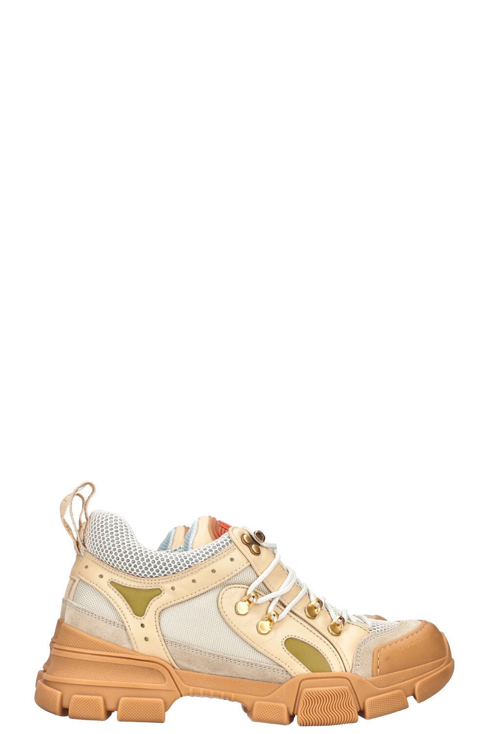 We love: Gucci Flashtreks mit Kontrast Elementen. Prominenter Gucci Schriftzug an der Lasche und markante Sohlen