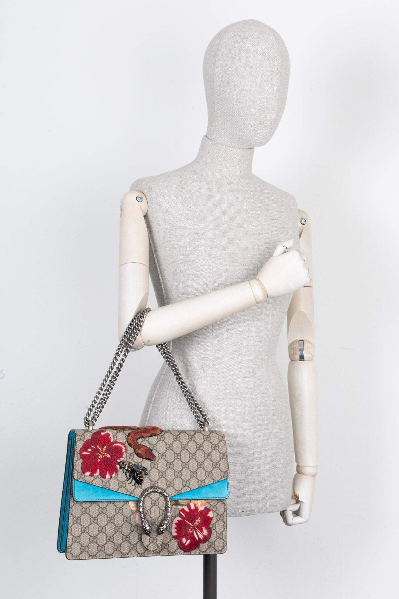 About: Die Dionysus wurde zum ersten Mal in der FW 2015 Kollektion vorgestellt und entwickelte sich in kürzester Zeit zu einer Gucci Favorite. Das Modell wurde nach dem griechischen Gott Dionysus benannt, welcher für Fruchtbarkeit der Vegetation und Euphorie steht. Man erkennt die Dionysus an ihrem unverkennbaren Tigerkopf Verschluss und den wild verzierten Details welche das Gucci Monogram schmücken.