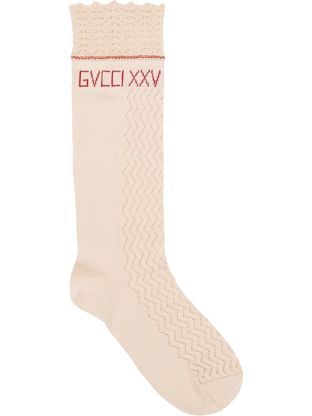 The Gucci GVCCI XXV Cotton Knit Socks in Ivory are calf length socks created in Italy. Crafted from pure cotton, these Ivory white and red Gvcci XXV socks from Gucci feature a contrasting ‘Gvcci XXV’ detail and a lace-effect trim.