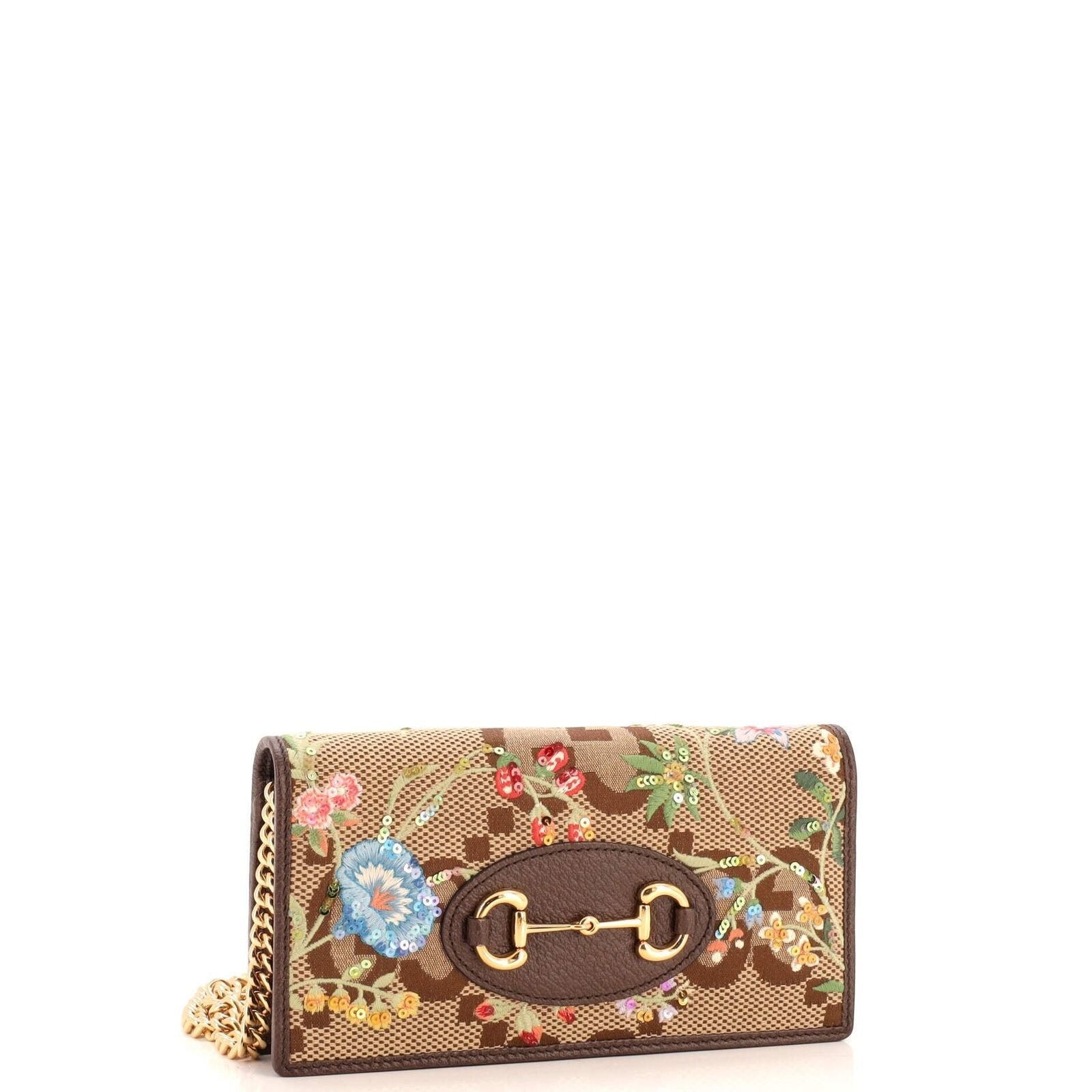 Elevate your accessory game with the Gucci Horsebit Chain Wallet in Jumbo GG canvas. This iconic piece features intricate embroidery that adds a touch of sophistication to your ensemble. The horsebit detail and chain strap exude luxury, making it a versatile choice for day or evening wear.