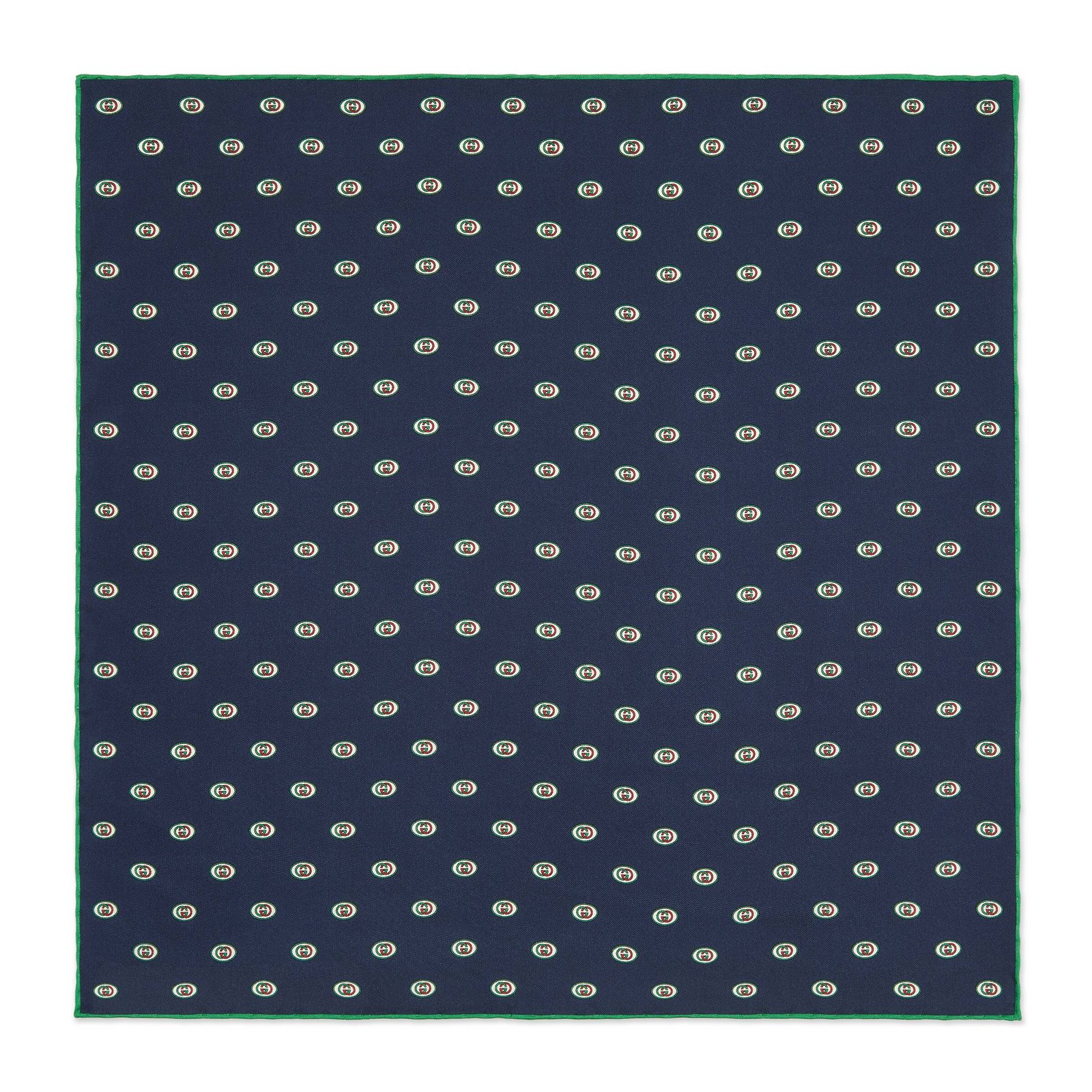The Gucci Interlocking GG Print Pocket Square in Midnight Blue is crafted in Italy of a smooth silk twill. This pocket square features a pattern of the interlocking GG in red and green, encased in a white circle. This design lays on top of a dee navy base and is accented with vibrant green, rolled edges.