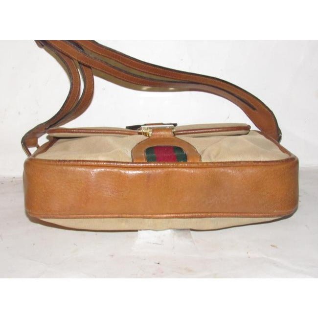 * For sale is a Gucci, tan colored canvas and medium brown leather, XL, structured, rectangular , envelope top, satchel style shoulder bag with a red and green, center striped, bold gold, locking snap center, bold gold accents, a removable/adjustable, wide leather, dual buckle strap in an early Jackie O type style! This is the perfect purse with the signature Gucci look that will never go out of style!
