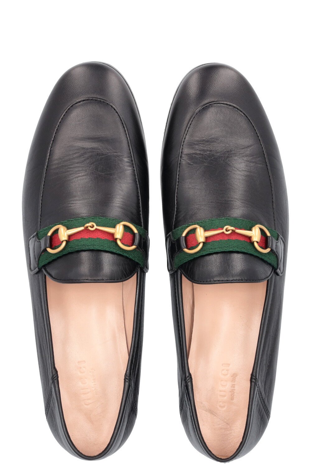 Die Gucci Jordaan Loafer in Schwarz vereinen klassisches Design mit markanten Details. Gefertigt aus geschmeidigem schwarzen Leder, präsentieren sie das ikonische Horsebit-Detail, unterlegt mit dem charakteristischen grün-roten Webstreifen – eine subtile Hommage an Guccis reiche Geschichte. Die schlanke Silhouette und die hochwertige Verarbeitung machen diesen Loafer zu einem vielseitigen Begleiter für verschiedenste Anlässe. Ein zeitloses Schuhwerk, das Eleganz und Tradition stilvoll verbindet.