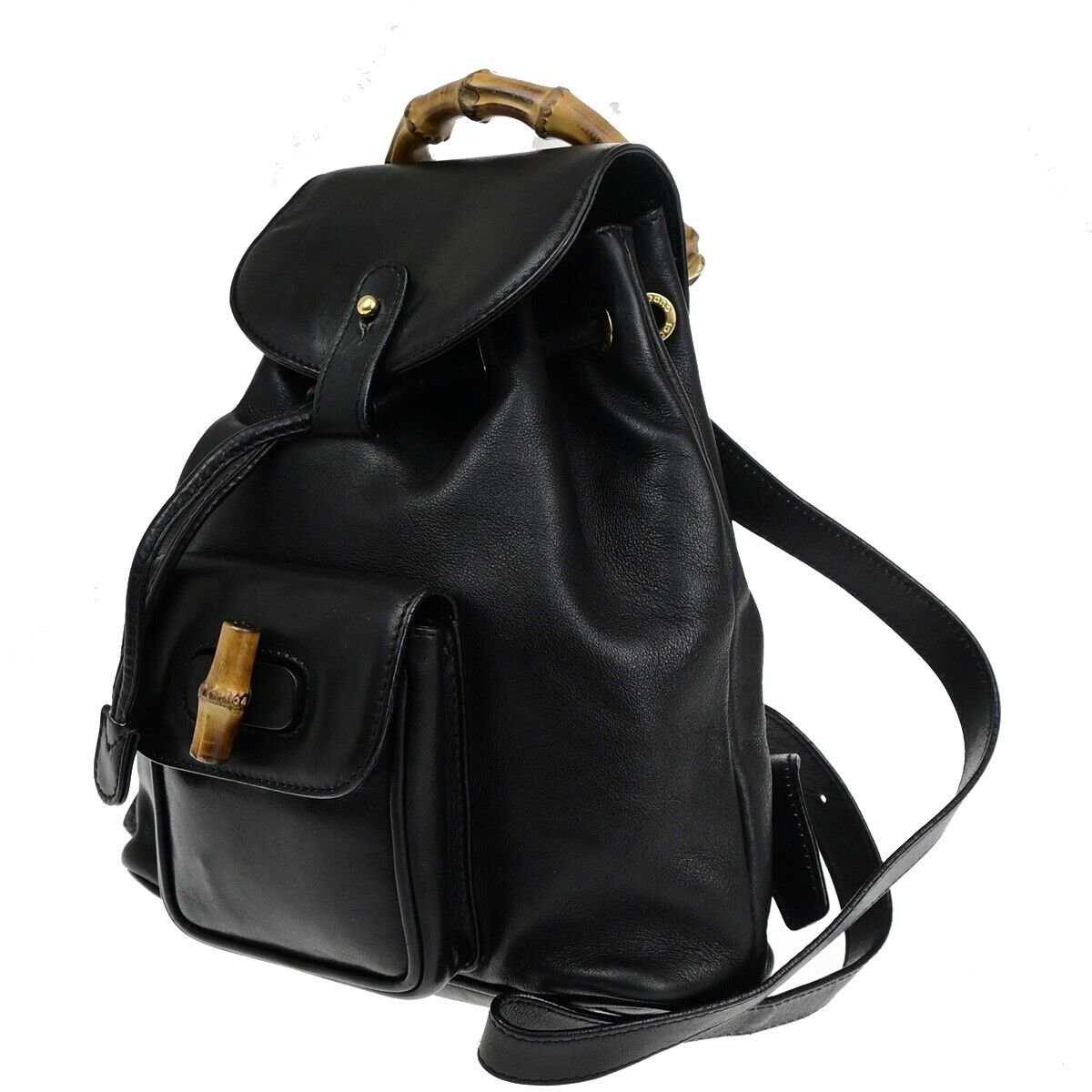 Elevate your style with the Gucci Logo Bamboo Drawstring Backpack. Crafted in Italy from luxurious black leather, this bag exudes sophistication and elegance. The iconic Gucci logo and gold-tone hardware add a touch of glamour to any outfit. Perfect for both casual outings and special occasions, this backpack is a versatile and chic accessory for the modern fashionista.