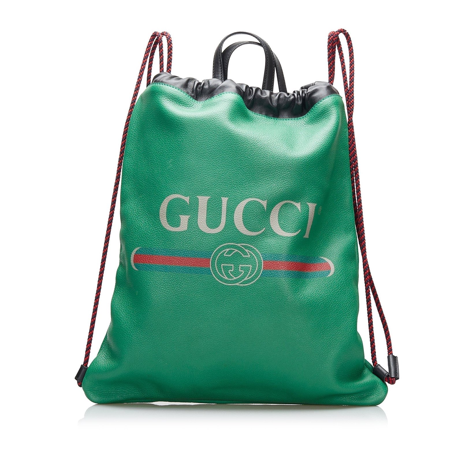 This backpack features a leather body, flat leather top handles, rolled back straps, and a top drawstring closure.