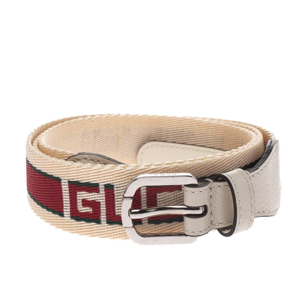 The Gucci Logo Fabric Belt with Web in White is crafted in nylon fabric is crafted in Italy. This durable belt features the Gucci logo, a red stripe web running down the belt, leather ends and a classic buckle.
