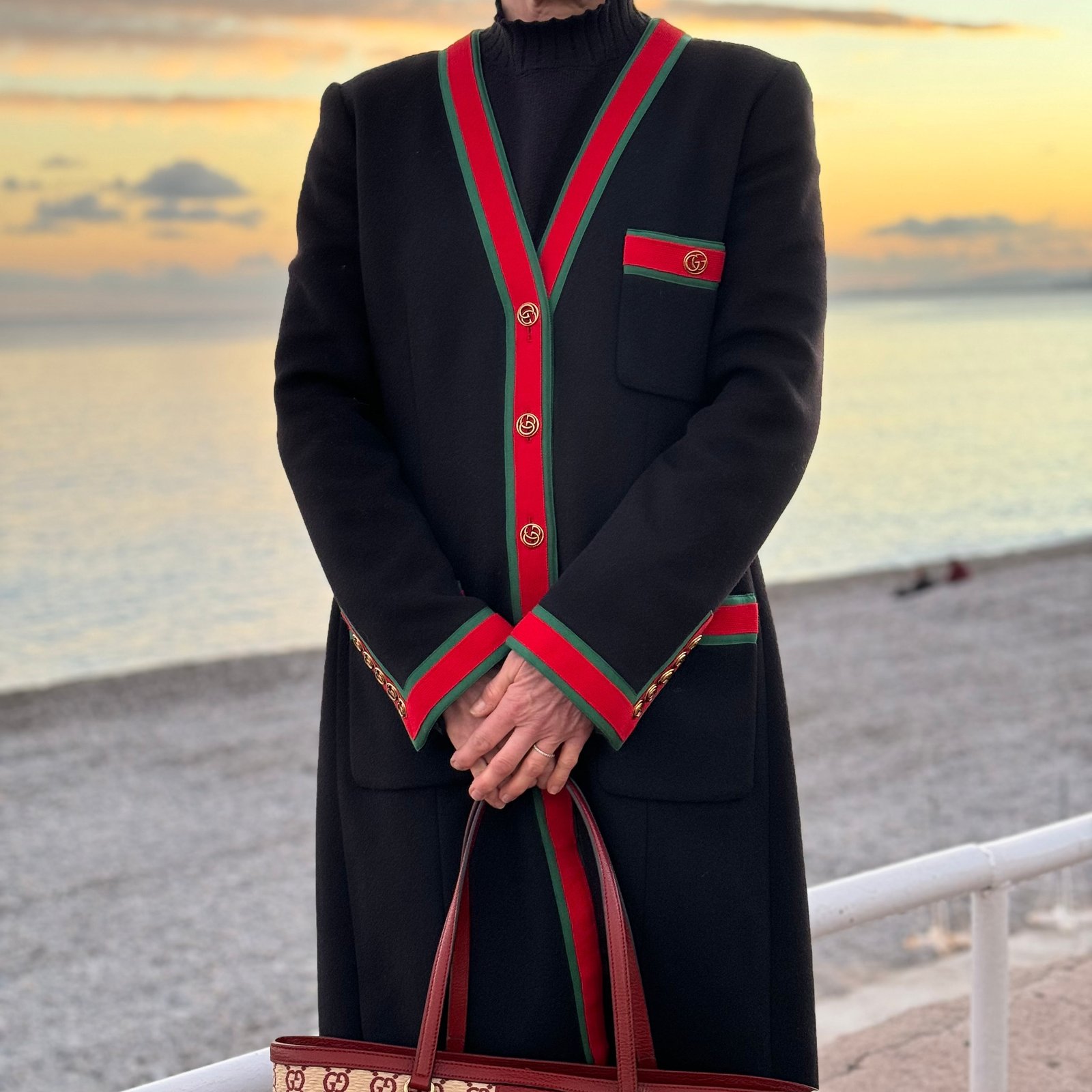 Ce manteau long ajoute une dose de style luxueux à toute garde-robe hivernale, incarnant l’esthétique distinctive de la marque italienne avec sa bande web verte et rouge ainsi que ses boutons distinctifs dorés.