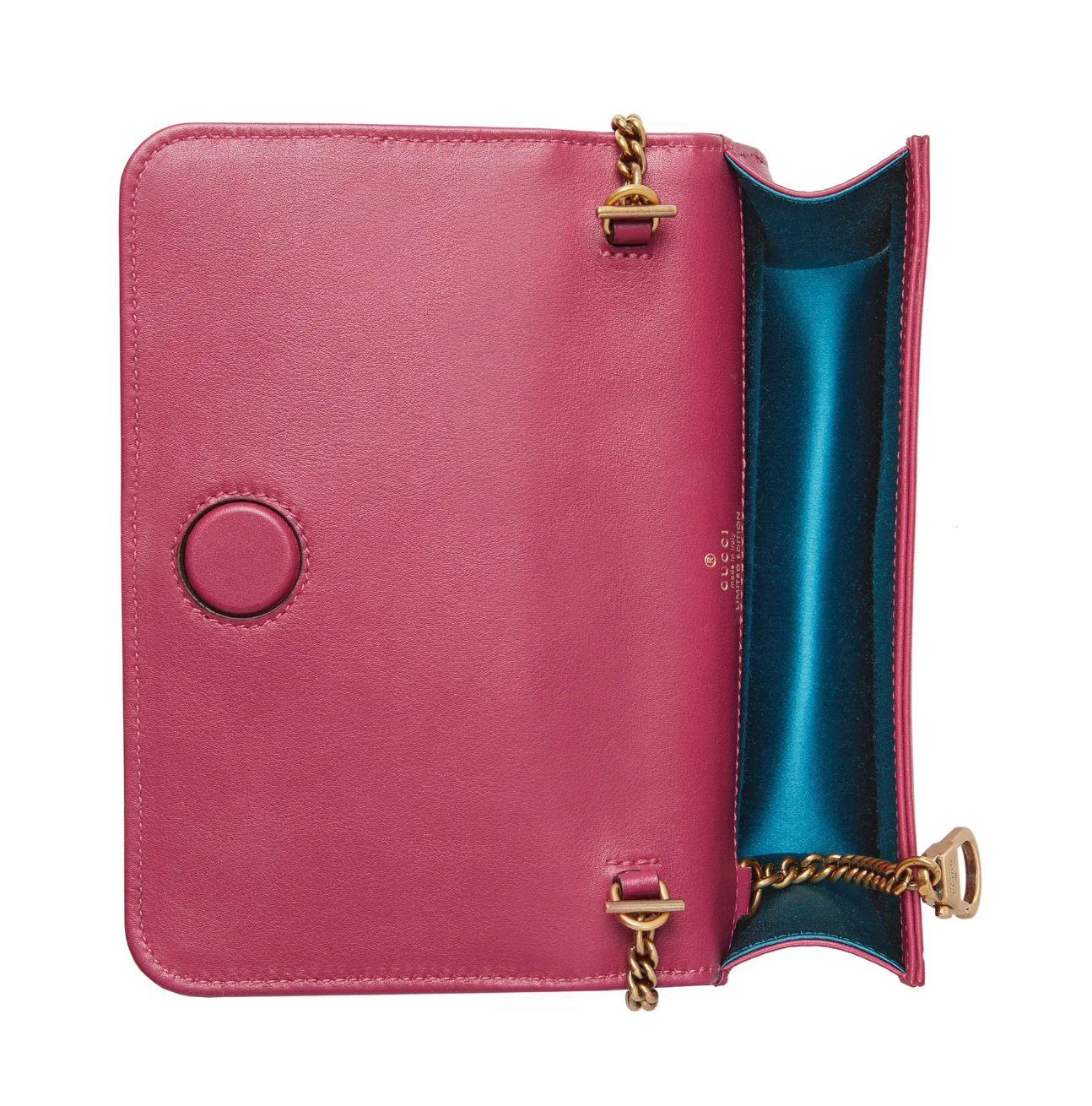 The Gucci Marmont Velvet Love Mini Shoulder Bag in Pink is velvety and gorgeous. Spelled out in imitation pearls and surrounded by sparkling beads, the word ‘love’ is flanked by flowers and set against plush pink velvet on this quilted shoulder bag. GG hardware in a warm golden tone, a silk-lined interior and a heart stitched at the back complete the stunning style.