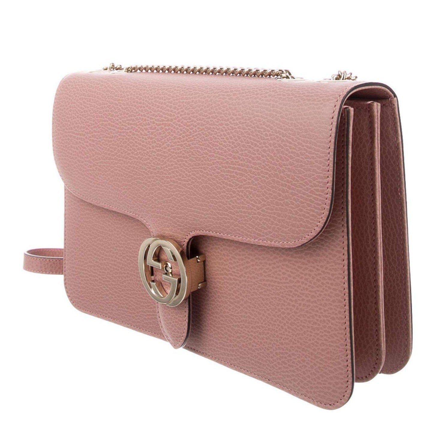 The Gucci Medium Interlocking GG Crossbody bag in Soft Pink is crafted from a pebbled, calfskin leather. This medium sized shoulder bag features a top flap closure with an interlocking GG clasp, a chain strap, 2 main interior compartments, and 1 zip pocket.