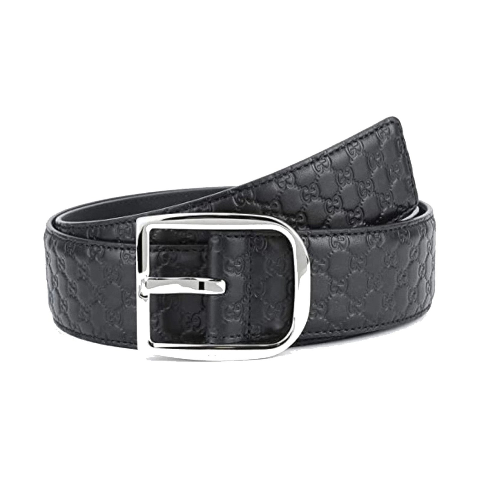 This belt from Gucci is crafted with a black smooth calfskin leather. The leather features the Microguccisima debossed pattern throughout. The belt is topped off with a gold-tone buckle with an engraved Gucci logo.