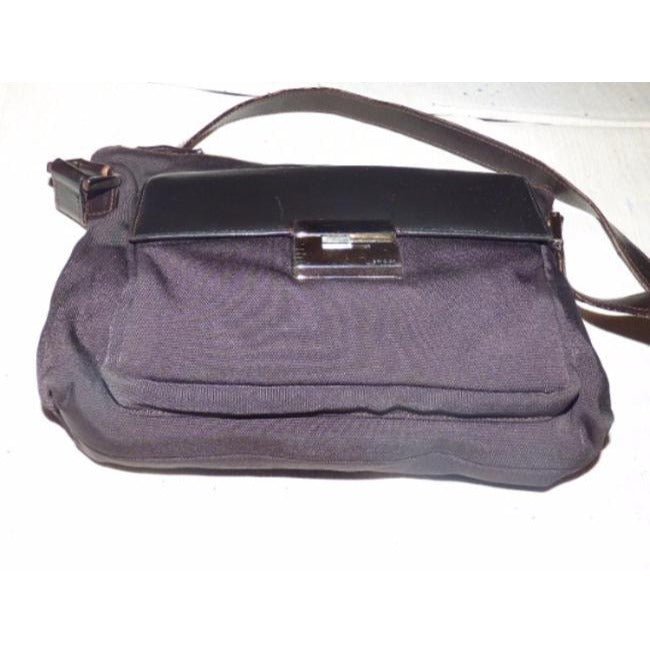 The bag is a zip top, shoulder style purse made of nylon with a single leather strap. It has an exterior pocket with a leather flap top and a large squared G chrome logo clasp. This purse is designed in such a classic style! The purse majority of the purse is brown nylon with brown leather accents at the front pocket and strap