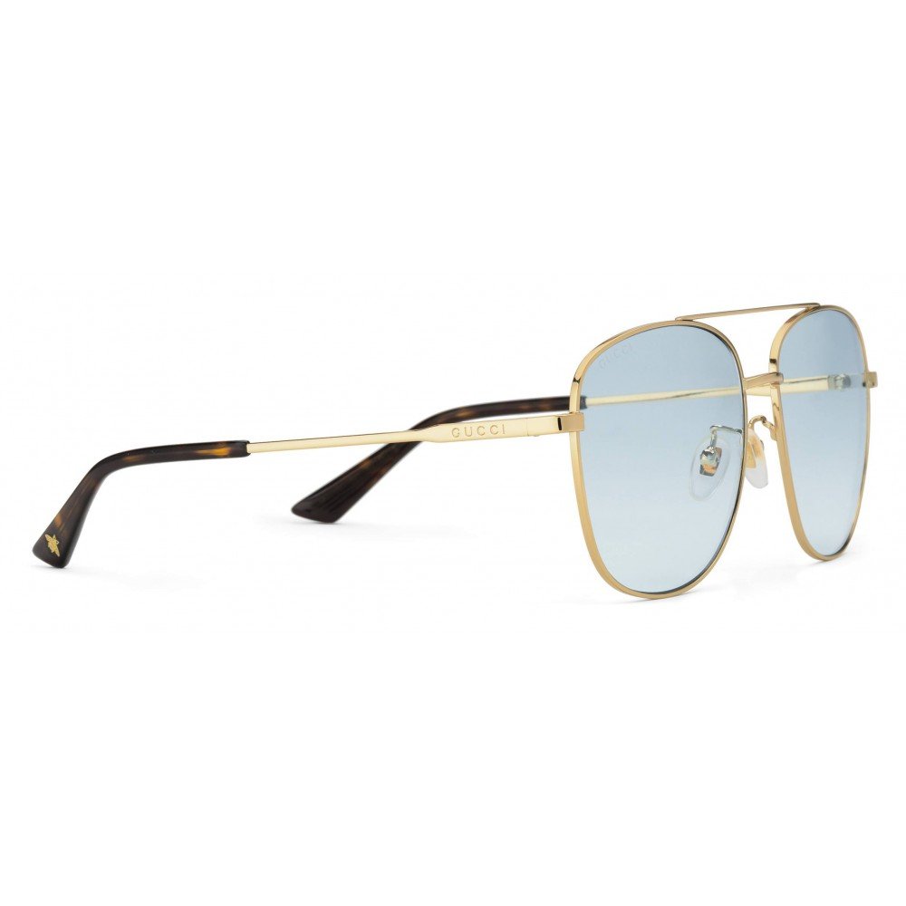 The Gucci Metal Framed Navigator Sunglasses in Gold are crafted in Japan from a gold-tone metal in a high polish finish. These sleek sunglasses feature an aviator style metal frame with soft blue tinted lenses, tortoise shell brown ear piece ends, and Gucci logo engravings.